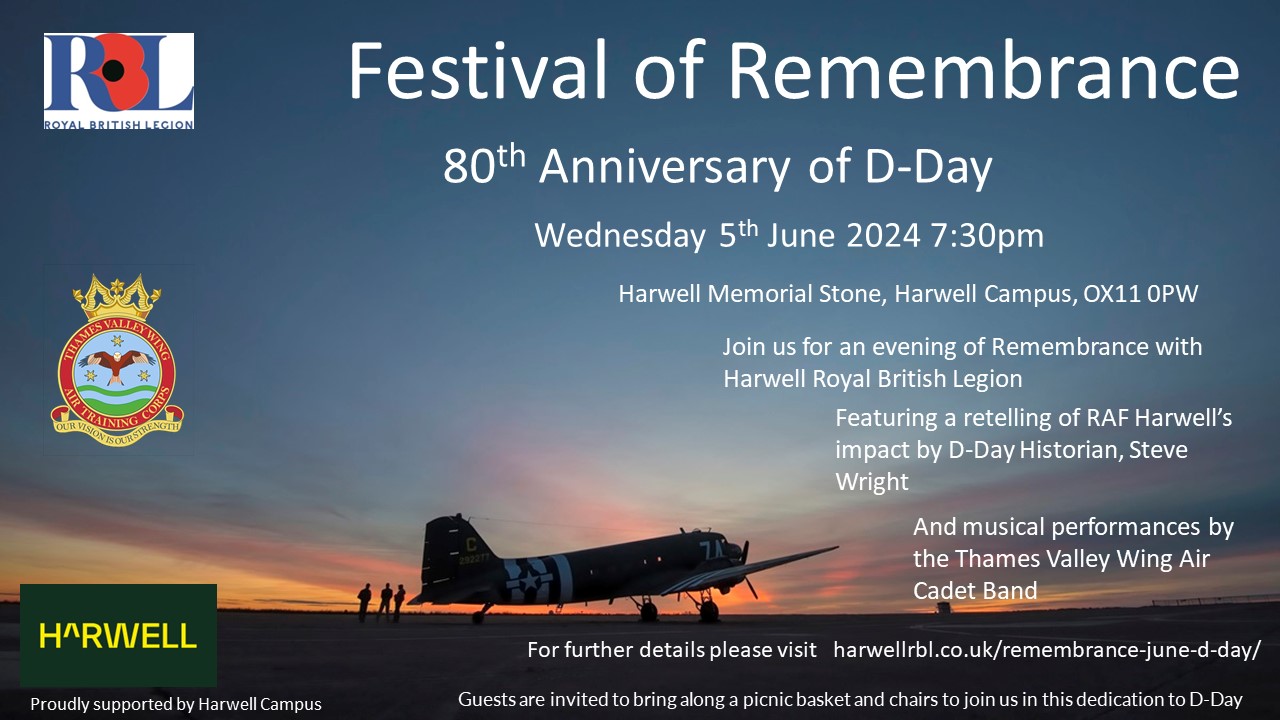 In recognition of the 80th Anniversary, Harwell Branch is holding a Festival of Remembrance at the stone, which will include a historical telling of the part RAF Harwell played, 2 minutes silence and musical interludes from a band.